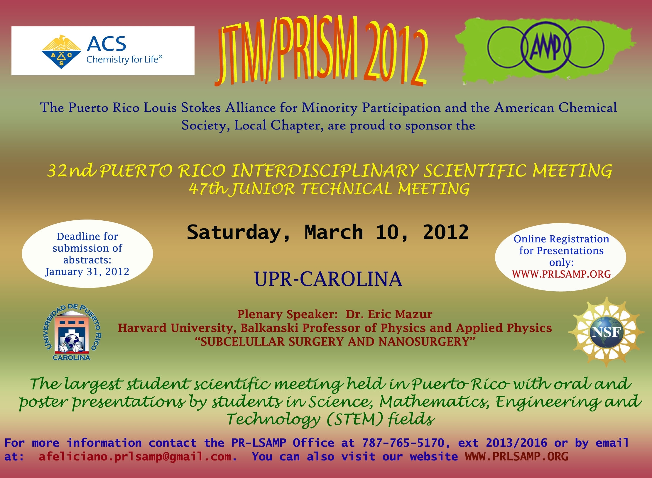 The registration for the 2012 Puerto Rico Interdisciplinary Scientific Meeting (PRISM) sponsored by the Puerto Rico Louis Stokes Alliance for Minority Participation (PR-LSAMP) is now open. The PRISM will take place on March 10, 2012 at University of Puerto Rico Carolina Campus. We will like to encourage undergraduate and graduate students from Puerto Rico and mainland institutions to present at the largest annual interdisciplinary scientific forum offered in Puerto Rico where over 300 science, technology, engineering and mathematics (STEM) undergraduate and graduate students present their research projects to their peers and faculty members. Undergraduate students present their research projects in oral concurrent sessions while graduate students present their work at a poster session in the afternoon. Pre-registration through our website is only required for students presenting their work and any secondary presenters in the case of two students presenting the same work (http://www.prlsamp.org/). Last year, over 800 students and professors attended the event, including 15 students from mainland LSAMP institutions.