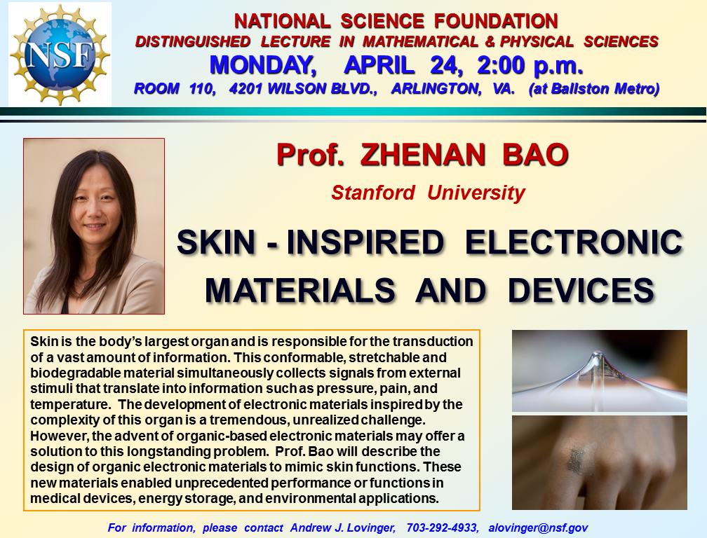 Skin is the body’s largest organ and is responsible for the transduction of a vast amount of information. This conformable, stretchable and biodegradable material simultaneously collects signals from external stimuli that translate into information such as pressure, pain, and temperature. The development of electronic materials inspired by the complexity of this organ is a tremendous, unrealized challenge. However, the advent of organic-based electronic materials may offer a solution to this longstanding problem. Prof. Bao will describe the design of organic electronic materials to mimic skin functions. These new materials enabled unprecedented performance or functions in medical devices, energy storage, and environmental applications.