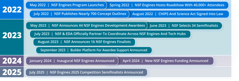 - July 2023: NSF and U.S. Economic Development Administration officially partner to coordinate across NSF Engines and Tech Hubs.