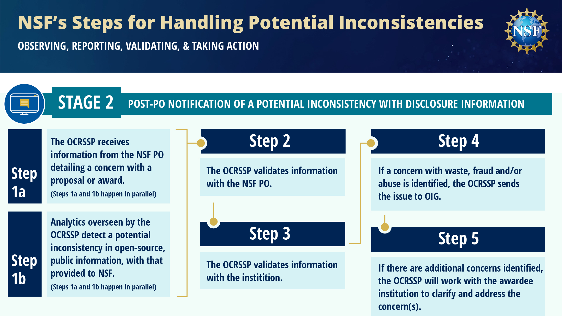 - NSF will only engage with the SRO to verify a potential inconsistency. Neither the OCRSSP nor the program officer will engage with the PI on the matter.