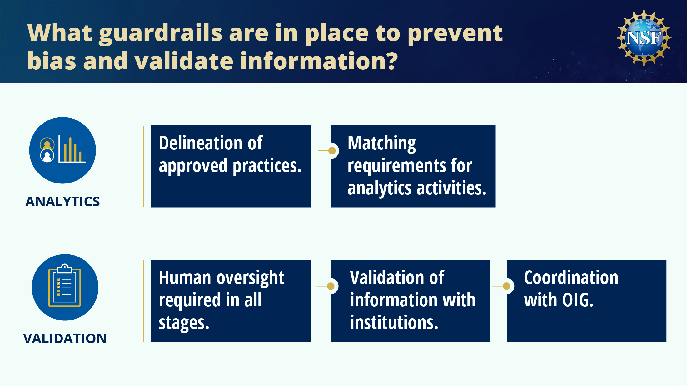 Safeguarding NSF's analytics process is a top priority for the agency, and human oversight is a paramount requirement for all information sharing activities. No information on individuals may be reported and no adverse action may be taken based solely on a potential inconsistency without human verification of the matching criteria.