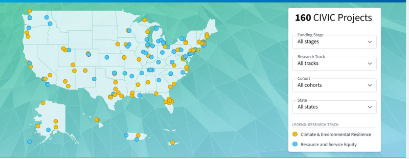 The program design and philosophy of CIVIC aligns closely with NSF's mission of promoting the progress of science and advancing national health, prosperity and welfare, especially when it comes to building resilient communities, promoting equity and addressing environmentally related instability and disasters. By funding projects that address these critical issues, CIVIC not only supports NSF's goals and strengthens ties between the scientific community and the public but also contributes to the administration's vision of a more equitable and sustainable future. Highlighted below are just some of the 22 pilot projects in the CIVIC 2.0 cohort already demonstrating a range of tangible impacts in communities across the country.