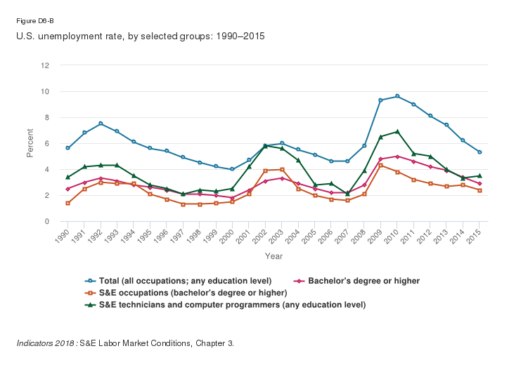 | Year | Total (all occupations; any education level) | Bachelor's degree or higher | S&E occupations (bachelor's degree or higher) | S&E technicians and computer programmers (any education level) |