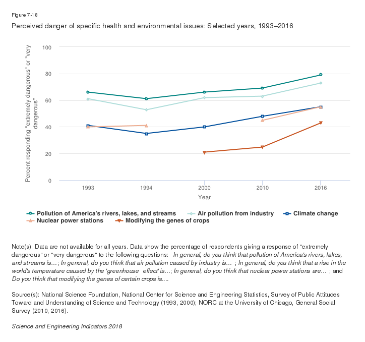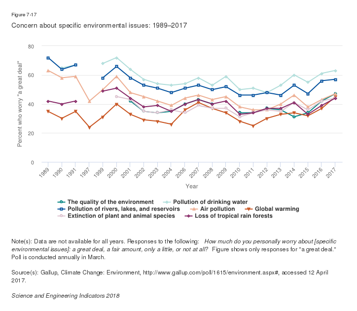 One noteworthy difference between the Gallup data (Figure 7-17) and the NSF data within the GSS (Figure 7-18) is that the Gallup data show a drop in concern about various environmental issues between about 2000 and 2010. In contrast, the NSF data show no such pattern. However, both Gallup and NSF data show increasing concerns after 2010.