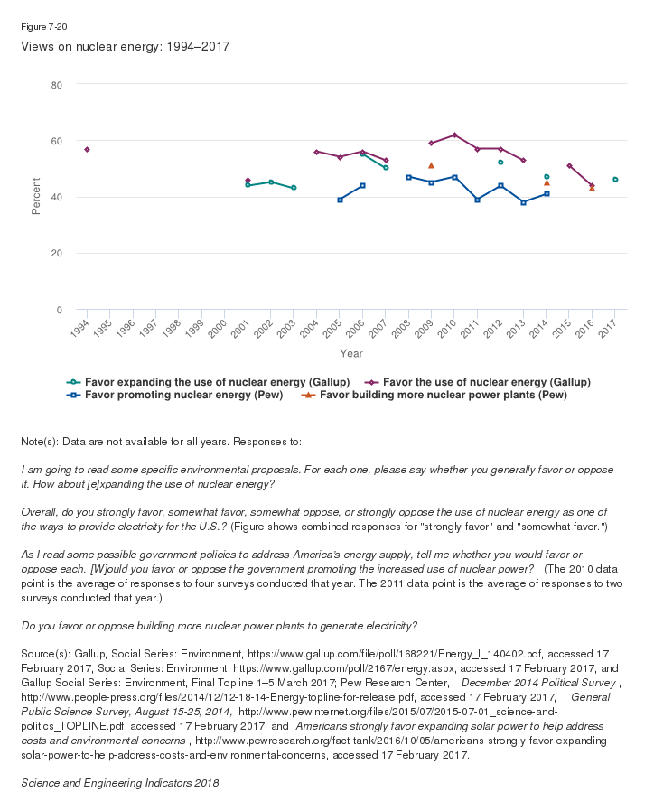 Attitudes about nuclear energy have become more negative in recent years. Support for nuclear energy likely peaked around early 2010. At that time, 62% of Americans told Gallup that they “strongly” or “somewhat” favored nuclear energy as “one of the ways to provide electricity for the United States.” In 2011, just prior to the nuclear accident in Fukushima, Japan, support had fallen to 57%. Gallup again assessed support at 57% in 2012, and support further fell to 44% by 2016 (Figure 7-20) (Gallup 2017b). The fact that attitudes about nuclear energy started becoming more negative prior to Fukushima and that support did not drop substantively in the Gallup data between 2011 and 2012 led the organization to argue that “energy prices and perceived abundance of energy sources” may be behind declines in nuclear support (Riffkin 2016). It may also be relevant that worry about other environmental issues began to increase around 2010 (see the discussion above about attitudes regarding the environment).