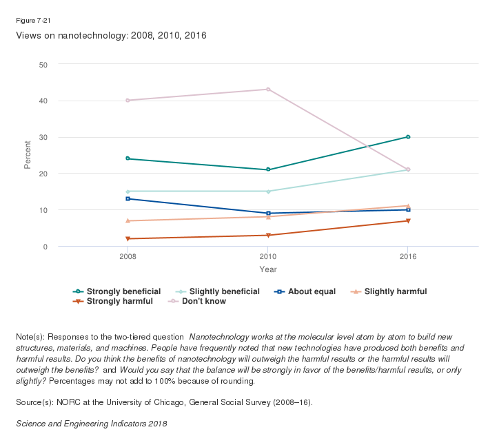 Recent data on public opinion about nanotechnology are limited, but the most recent GSS included a set of questions aimed at updating information previously collected by the NSF in 2006, 2008, and 2010, when there was concern that some Americans might come to see nanotechnology in the way that many people see GE food (e.g., [Einsiedel and Goldenberg 2006]). This does not appear to have happened yet. In 2016, 51% of respondents said they think that the benefits of nanotechnology will be greater than the harms (Figure 7-21; Appendix Table 7-37). This includes 30% who say they expect strong benefits and 21% who expect slight benefits. Another 18% said that they thought the “harmful results” would be greater, including 7% who expect strong harms and 11% who expect slight harms. About 10% volunteered that the benefits and harms would be about equal, and 21% volunteered that they did not know whether benefits or harms were more likely. In other words, these individuals asked to have their views recorded as seeing the benefits and harms as about equal or insisted they could not choose between benefits and harms, even though the survey questionnaire did not provide this option.